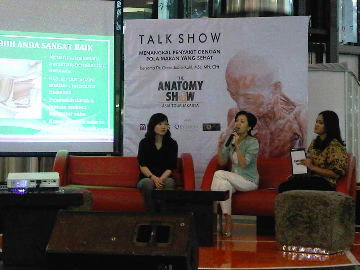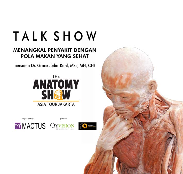 Jakarta, 18 Oktober 2010: Mactus, Pte Ltd, penyelenggara pameran tubuh asli Manusia “The Anatomy Show” mengadakan talkshow kesehatan yang berkaitan dengan penyakit dan pola makan yang sehat bersama dokter konsultan pengaturan berat badan dan ahli kesehatan, Dr. Grace Judio-Kahl, Msc, MH, CHt, hari ini di fX Atrium lantai 3, fx Mall Jakarta.